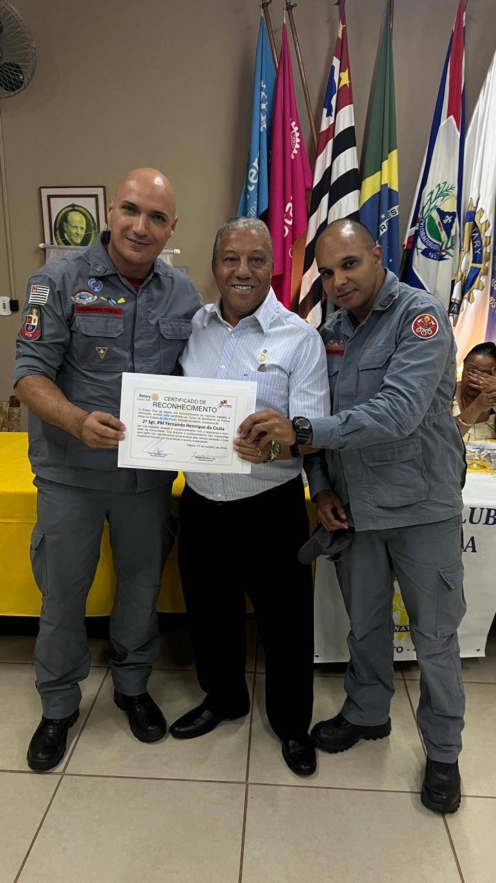 O Rotary Club de Itapira, em reconhecimento ao valoroso trabalho e dedicação, conferiu certificado ao Corpo de Bombeiros da Polícia Militar do Estado de São Paulo, Estação de Itapira na pessoa do 2º Sgt. PM Fernando Henrique da Costa, na reunião do dia 07/10/2024.
